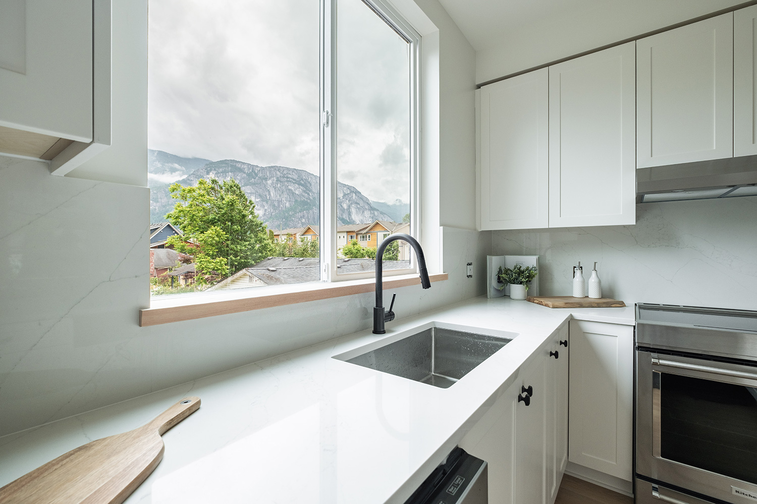 Bathed in natural light, the open concept main floor with East and West facing windows frame the Chief, waterfalls and the surrounding mountains. A kitchen designed for cooking in, with quality Kitchen Aid appliances and a peninsula counter perfect for casual breakfasts or entertaining.